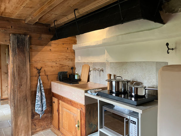 Die Küche ist kompakt und funktional eingerichtet. Ein Induktionsherd mit zwei Kochstellen, eine Mikrowelle und ein kleiner Kühlschrank stehen bereit. Es gibt im Dorfhaus keinen Geschirrspüler, dafür alles Nötige für den Abwasch von Hand. In der Kaffeeecke findest du eine hochwertige ESE-Espressomaschine und eine Auswahl an feinen Tees. Ausserdem findest du Bio-Gewürze und Kräuter, Salz und Zucker sowie selbstgemachten Essig und hochwertige Öle – ideal, um mit wenigen guten Zutaten etwas Feines auf den Tisch zu zaubern.